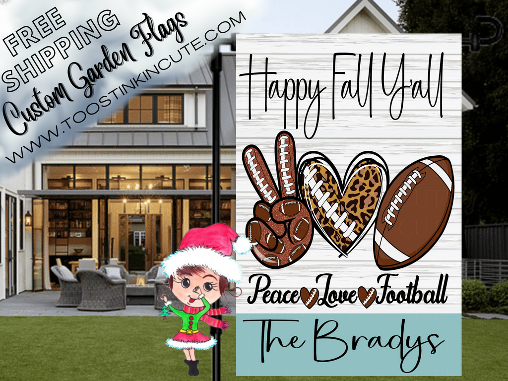 Welcome the vibrant hues of fall into your yard with our Peace, Love, and Football garden flag. This charming accessory boasts a rustic wood background, perfectly capturing the essence of autumn. Whether you're a football enthusiast or just a fan of cozy fall vibes, this flag is the ideal addition to your outdoor décor.