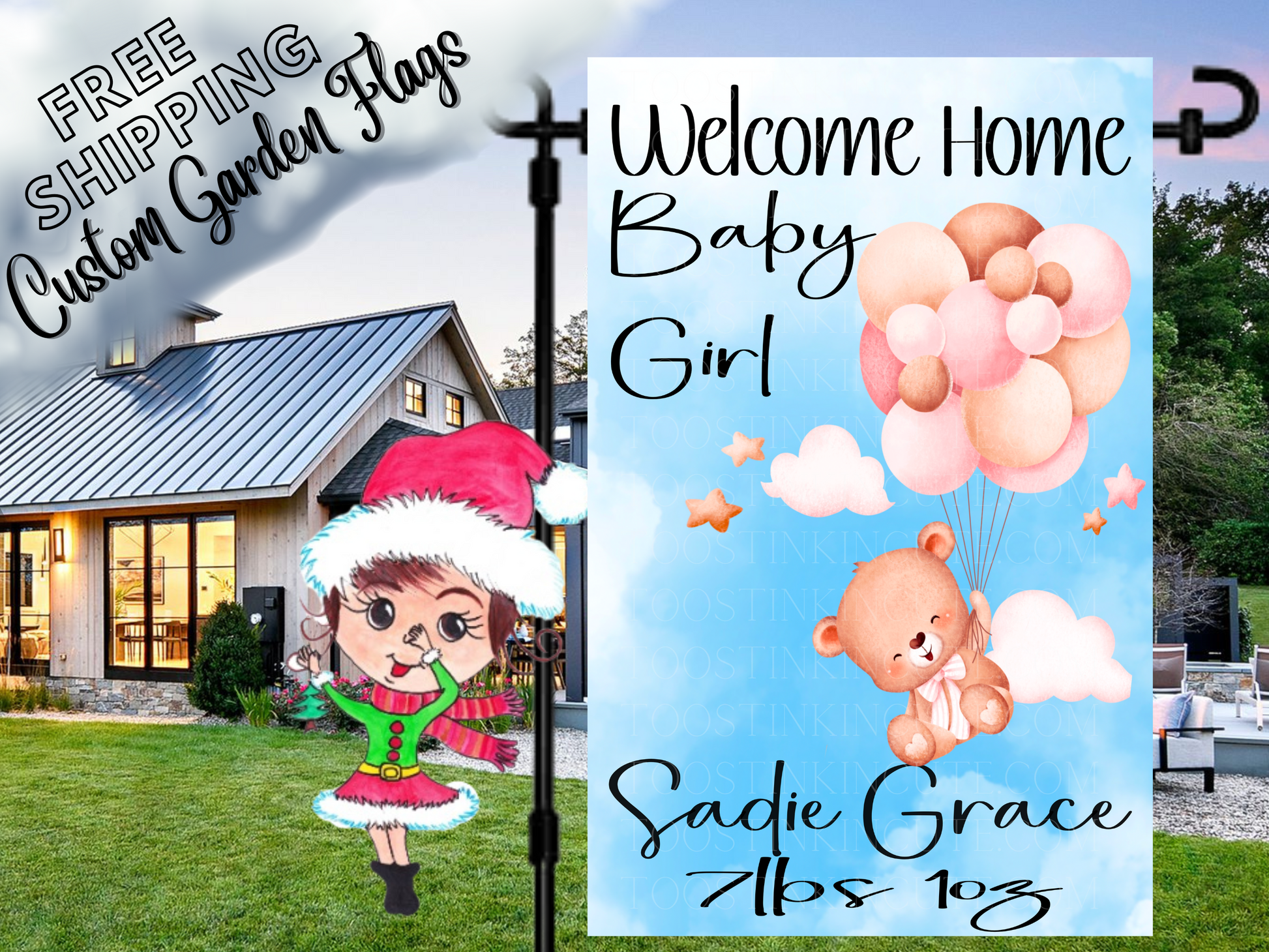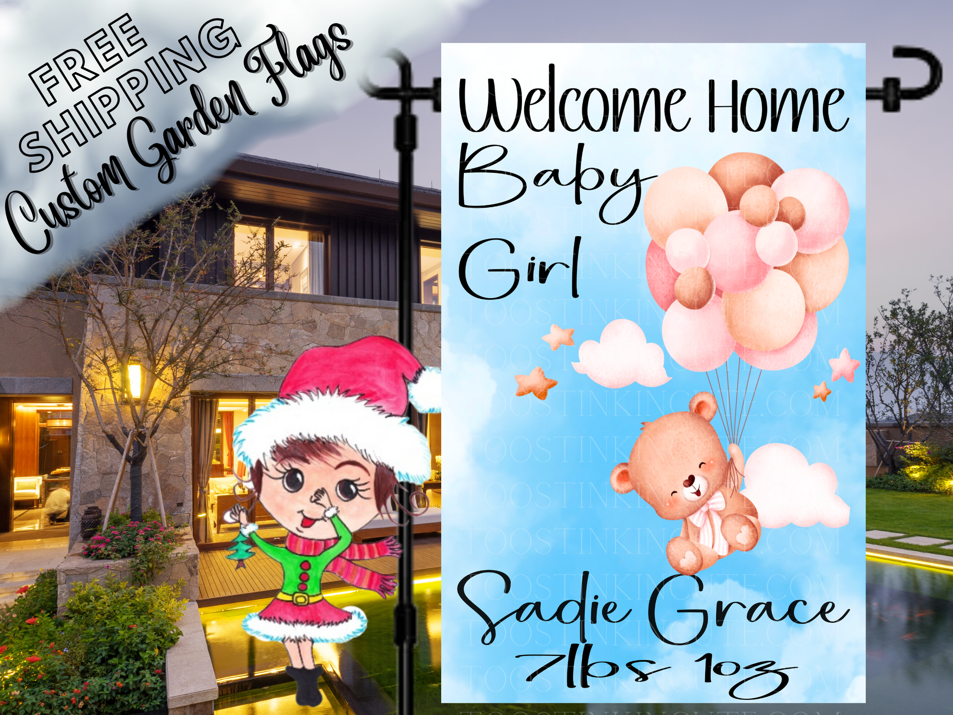 Make your garden look even more beautiful with our custom garden flag. Featuring a stunning gradient blue sky background, this flag shows a little baby girl teddy bear floating in the air with balloons. The flag has a special message that reads "Welcome Home Baby Girl", which can be customized to feature your new bundle of joy's name and birth weight.
