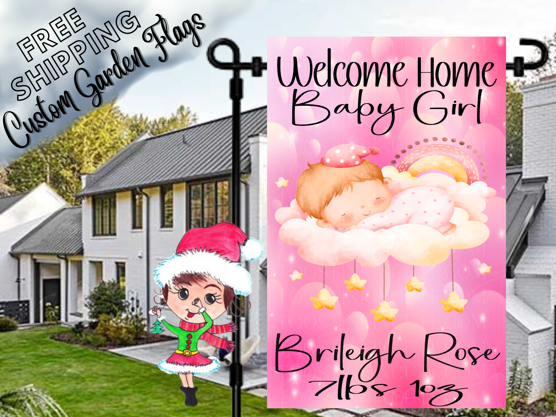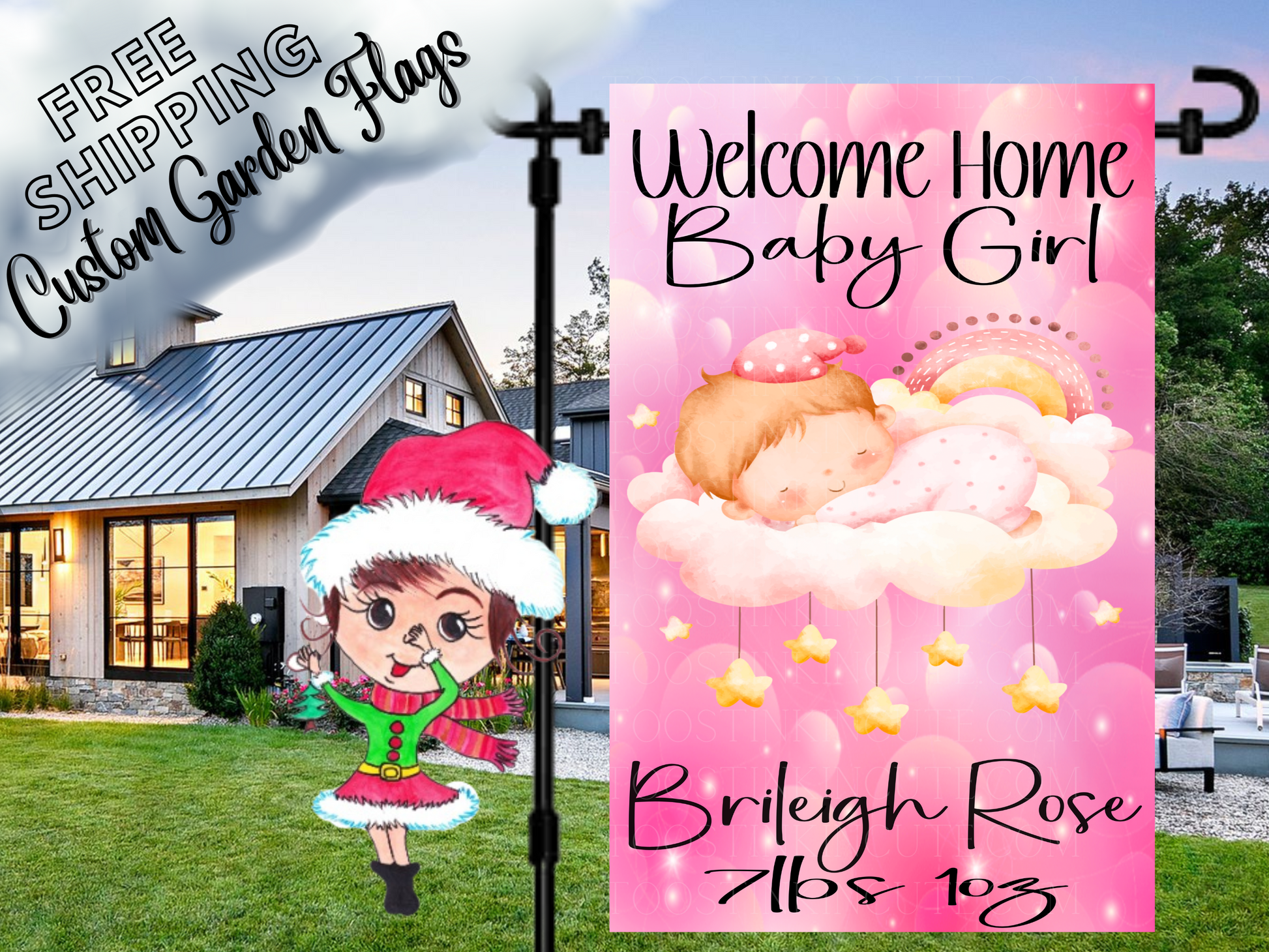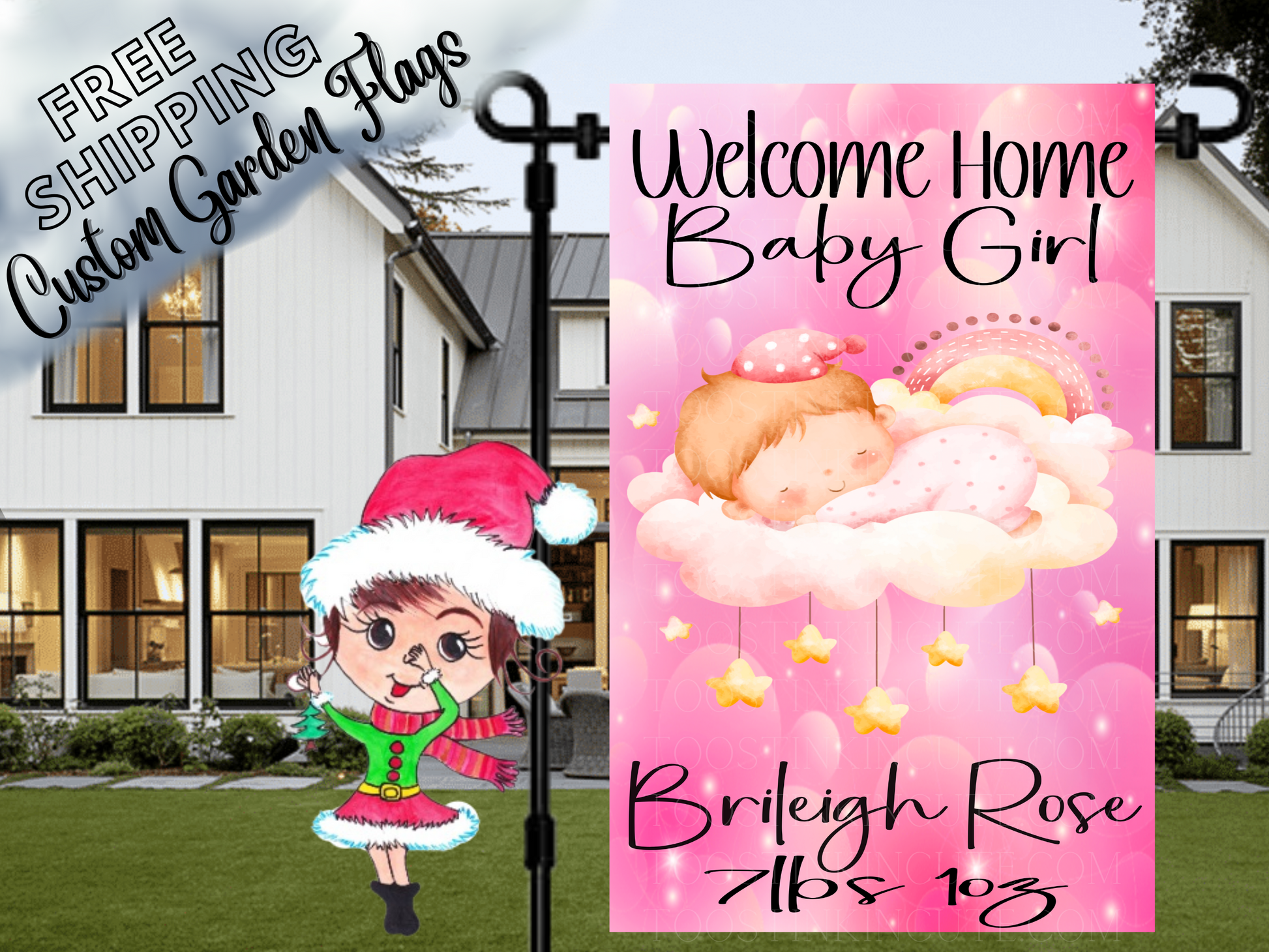 Welcome your new baby girl home with this beautiful custom garden flag. The stunning gradient pink background provides the perfect backdrop for the little baby girl floating on a cloud with stars hanging. The saying "Welcome Home Baby Girl" can be altered to make it your own for your new bundle of joy.