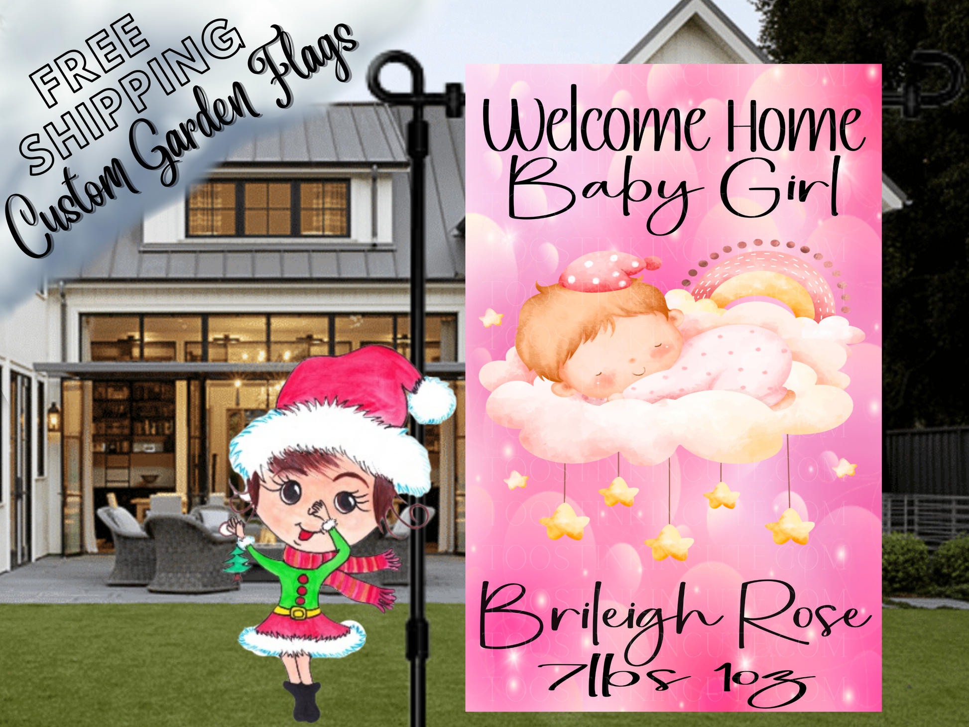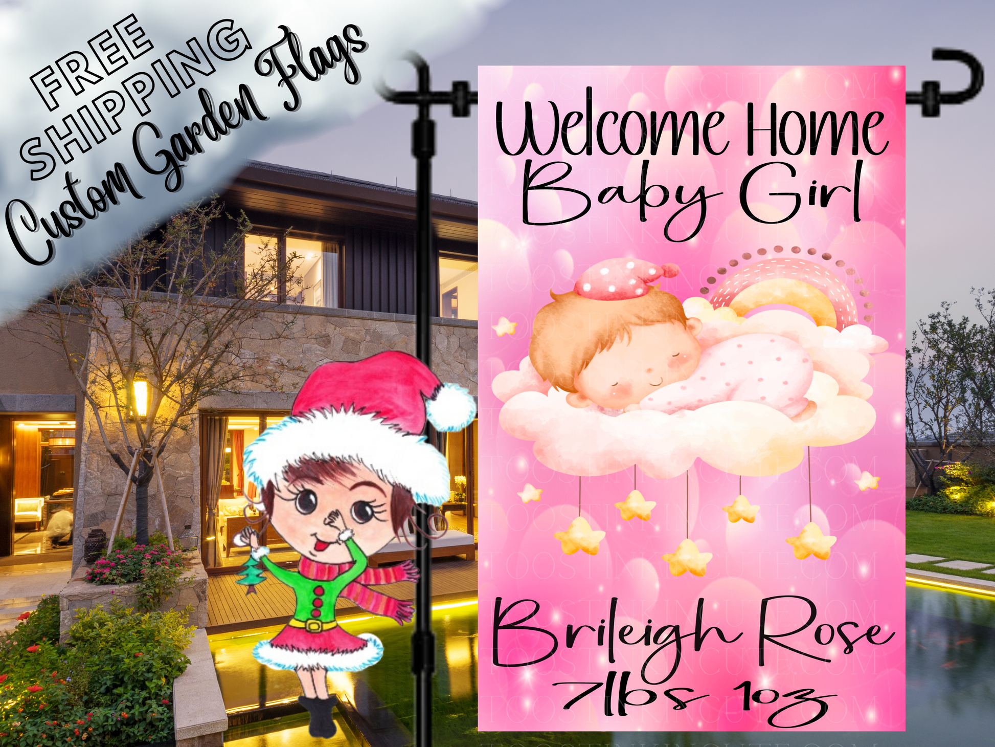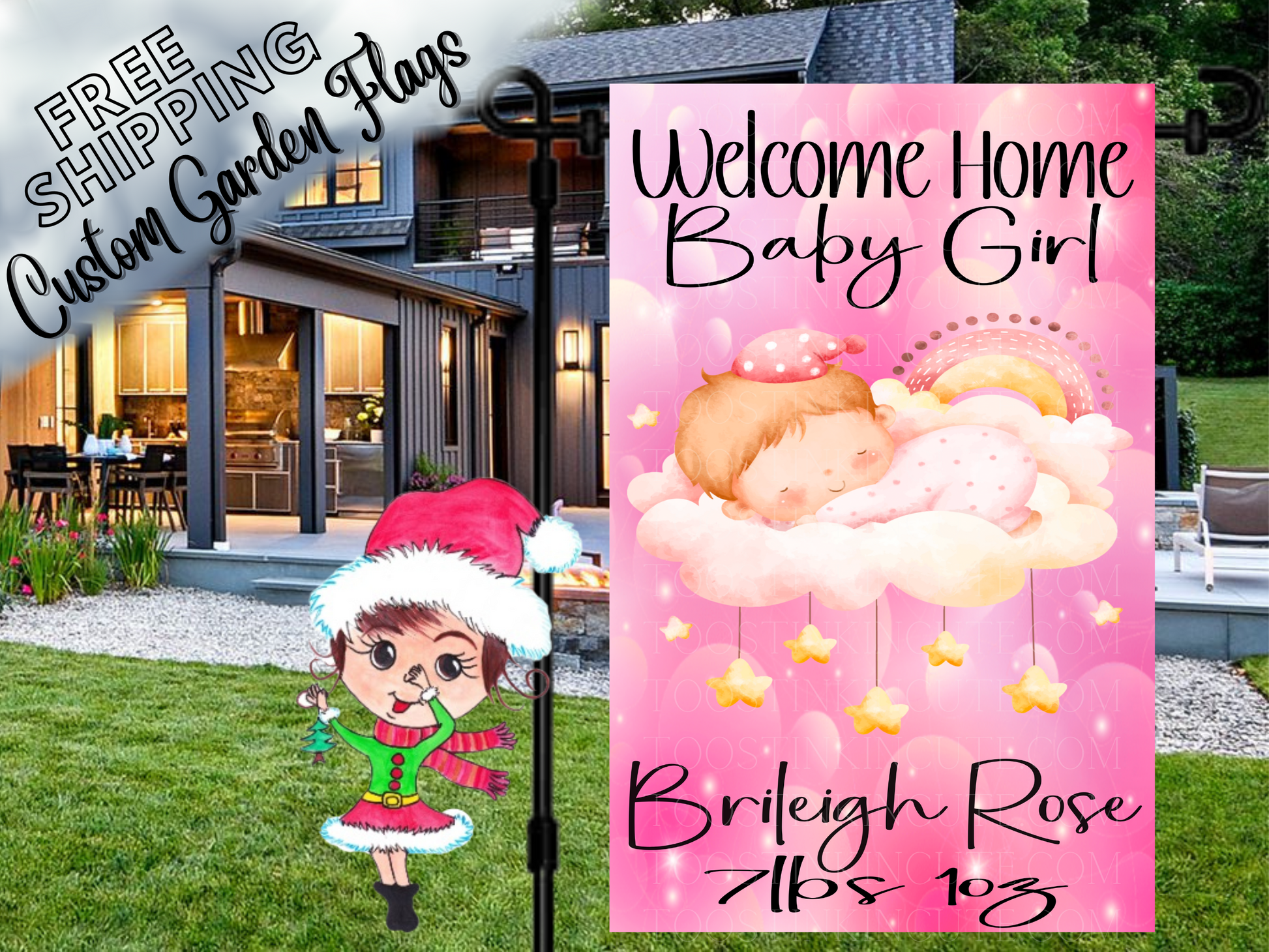 Welcome your new baby girl home with this beautiful custom garden flag. The stunning gradient pink background provides the perfect backdrop for the little baby girl floating on a cloud with stars hanging. The saying "Welcome Home Baby Girl" can be altered to make it your own for your new bundle of joy.